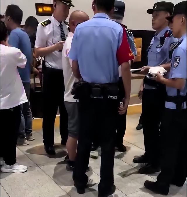 安全员拿着从男子身上收缴的香烟和手机,4位车站民警给男子戴上手铐