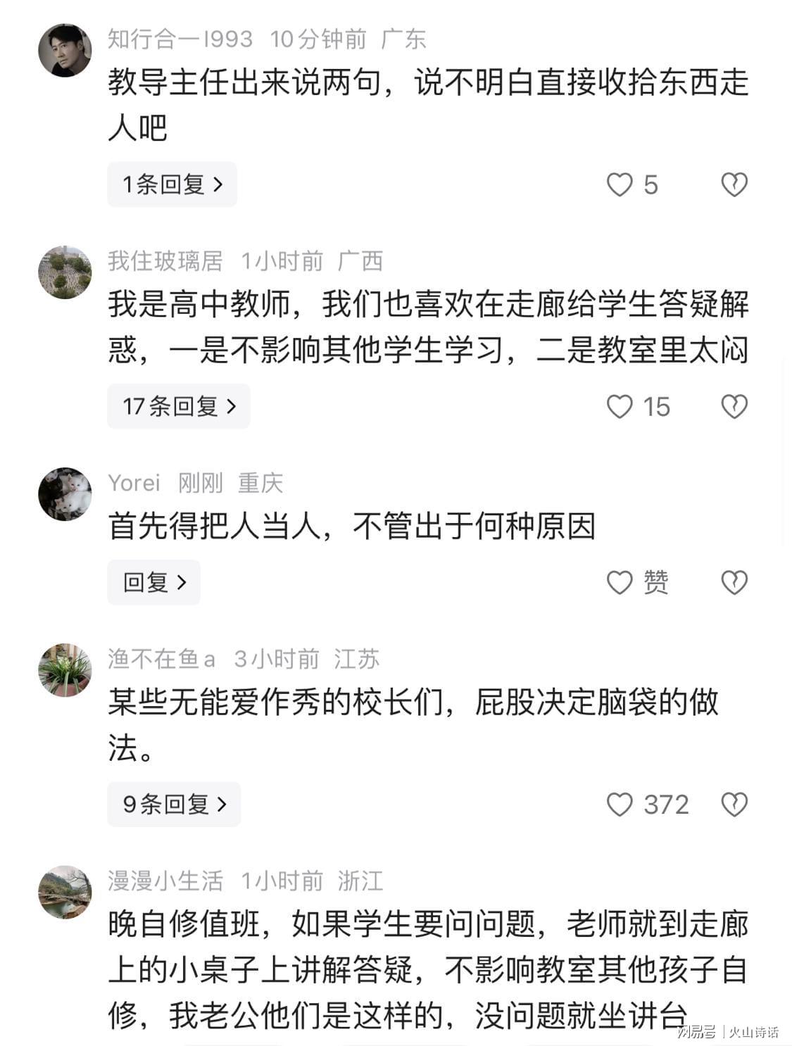 有网友表示,我是高中教师,我们也喜欢在走廊给学生答疑解惑,一是不影响其他学生学习,二是教室里太闷。